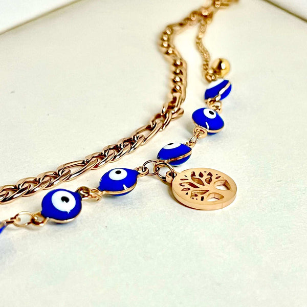 This layered bracelet combines powerful protective symbols with elegant gold-plated chains. The piece features a row of vibrant blue evil eye charms believed to ward off negative energy, complemented by a beautifully detailed Tree of Life pendant symbolizing growth and connection. The contrasting chain styles—a delicate link chain paired with a sturdier curb chain—create visual interest and dimension that elevates this piece beyond ordinary accessories.