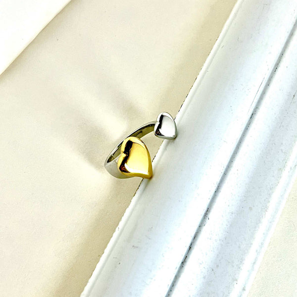 Introduce subtle romance to your everyday style with our Dual Heart Open Ring. This charming design features contrasting gold and silver hearts that face each other across an adjustable open band. The polished mirror finish creates a stunning play of light that enhances the symbolic connection between the two hearts—one in luxurious gold plate and the other in brilliant silver.